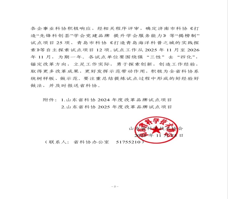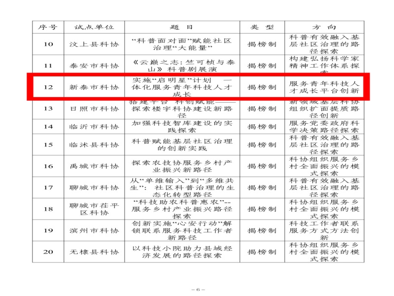 近日,山东省科协公布了2025年度改革品牌试点项目名单,“揭榜制”试点项目25项,自主探索试点项目12项,新泰市科协申报的《实施“启明星”计划, 一体化服务青年科技人才成长》项目成功揭榜,入选“服务青年科技人才成长平台创新”方向试点。